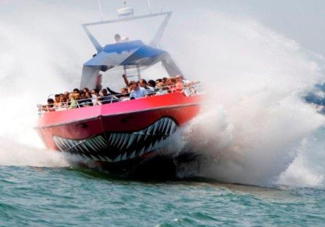 An exciting high-speed ride across turquoise waters, offering thrilling waves, ocean breeze, and stunning coastal views—perfect for adventure lovers.